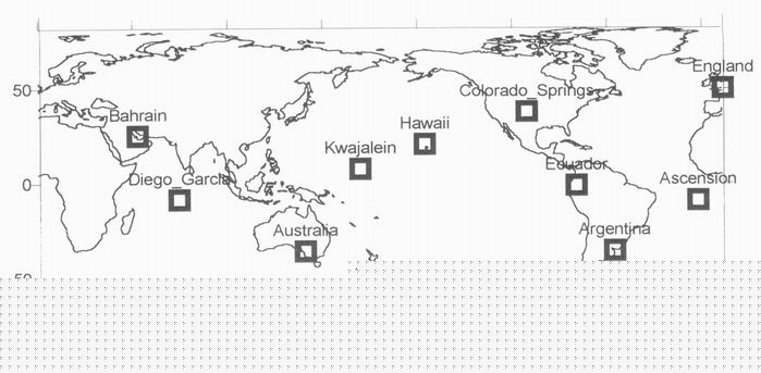 Sledovací stanice pozemního systému GPS, jejich souřadnice definují umístění a orientaci souřadnicového rámce systému WGS84 vzhledem ke geocentru a ose rotace